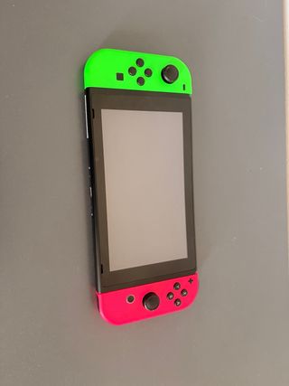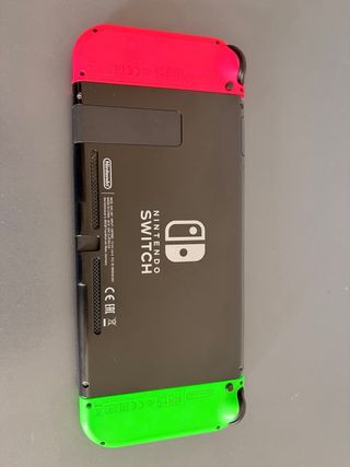 Consola Nintendo Switch con mandos de colores. - Mandos en color verde brillante. - Mandos en color rosa vibrante. - Dock set - Funda negra para guardar la consola, incluyendo complementos Está en perfecto estado funcionalmente, tan sólo tiene un arañazo