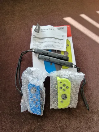 Mandos Joy-Con para Nintendo Switch en colores azul y verde lima. Incluyen correas. - Correas de sujeción de Regalo. - Mandos Joy-Con (izquierdo y derecho). - Correas para mandos.