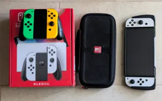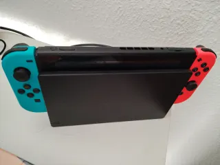 Consola Nintendo Switch modelo OLED. - Pantalla OLED de 7 pulgadas. - 64 GB de memoria interna. - Base con puerto LAN. - Soporte ajustable. - Tarjeta de memoria 64 GB. Completa, todo original y en su caja. Tiene puesto el protector de pantalla de vidrio templado. Se incluye un segundo mando con dos joy-con originales y carcasa antigolpes compatible con el dock. También se incluye funda de transporte original de Nintendo.