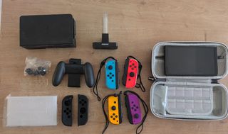 Pack de accesorios para Nintendo Switch OLED. - Base de carga. - Funda de transporte. - Mando con agarre. - Joy-Cons de colores (azul, rojo, amarillo, morado). - Protectores de pantalla.
