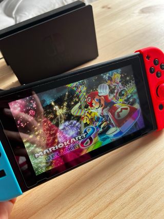 Consola Nintendo Switch con su funda protectora. - Joy-Con rojos y azules, rojo fosdorito y verde - Pantalla táctil. - Funda de transporte incluida. - Dos juegos que se pueden jugar 4 jugadores, Mario party y Mario kart 8. - Base de carga para poner en la tele y otra también para cargar todos los mandos. - Mandos ergonómico para poder jugar como si fuera un mando normal.