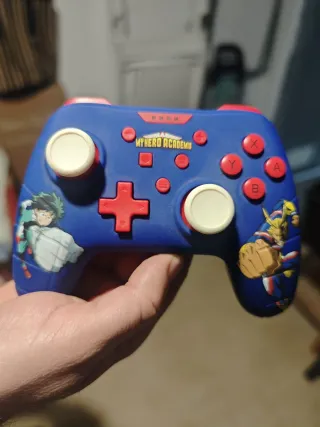 Mando personalizado con temática de My Hero Academia para Nintendo Switch. Presenta diseños de los personajes Deku y All Might. - Diseño azul con ilustraciones. - Botones de acción rojos. - Sticks analógicos blancos.