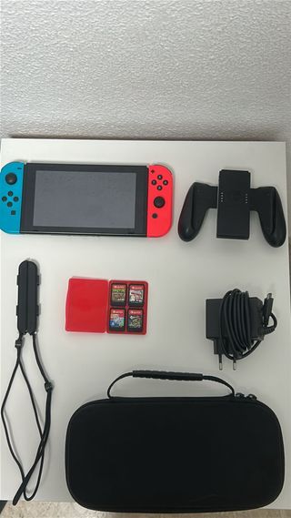Consola Nintendo Switch con accesorios. Consola usada por adulto y con muy poco uso. - Incluye base de carga. - Dos mandos Joy-Con, uno azul y otro rojo. - Cargador. - Funda protectora. - Protectores de mandos. - Cristal templado