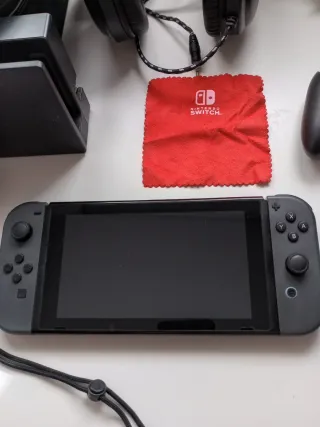Consola Nintendo Switch en perfecto estado, casi como nueva, con todos sus accesorios. - Incluye el juego Ring Fit Adventure. - Incluye el juego Nintendo Switch Sports. - Incluye el juego Mario Karts - Base de carga. - Mandos Joy-Con con agarre. - Auriculares. - Correa para Joy-Con. - Paño de limpieza. - Cargador. - Funda de transporte. - Aro para jugar