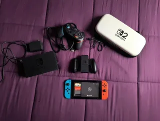 Nintendo Switch en buen estado, con algunos accesorios. Incluye: - Dock - Consola Nintendo Switch (azul y roja). - 2 Joy-Cons (uno azul y otro rojo). - Mando para poner los joy-cons - Funda rígida para transporte. - Funda solo para la switch - Cargador y cable USB. - Base de carga. - Base para cargar 4 joy cons