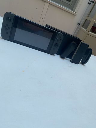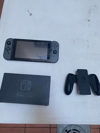 Consola Nintendo Switch en color gris y negro. Incluye la consola, base para conectar a la tv si se quiere, mandos, su cable y su cargador.