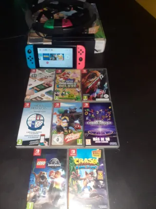 Nintendo en buen estado, viene con todo lo de la foto (lingüística mansión no) y se puede hablar lo de los juegos en digital. También viene con una tarjeta RAM de 64 GB. El mando pro está apañau pero funciona y el joycon azul va mal. Al labo solo lo falta el piano que puedo entregarlo con el montau o desmontau como prefieras. Cualquier cosa decir sin compromiso. PRECIO ALGO NEGOCIABLE