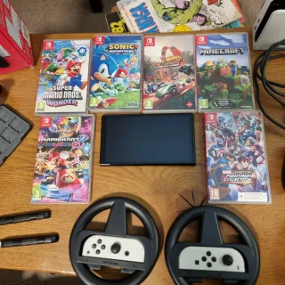 Consola Nintendo Switch OLED en color blanco, lista para horas de diversión. Incluye 3 videojuegos originales y muchos más en su memoria interna. - Sonic Superstars - Minecraft - Hot wells,unleashed 2 turbochargerd. Más mochila mariobros de neopreno anti, agua. Más un mando extra y dos volantes , más caja para guardar juegos, con todos sus cables de conexión más hdmi, tiene 8 meses y apenas se a jugado, está nueva impoluta con su caja, le regalaron la play station 5 y mi niño la dejo de lado , por eso la vendemos, .lo vendo todo en 350 euros