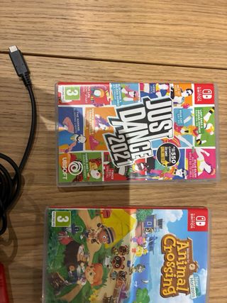 Consola Nintendo Switch con accesorios y juegos. - Incluye dos juegos: Just Dance 2021 y Animal Crossing. - Incluye mandos Joy-Con con agarre. - Incluye cargador y base de carga. - Incluye funda protectora para la consola.