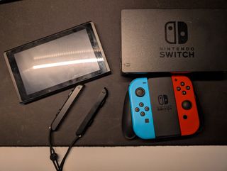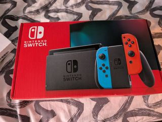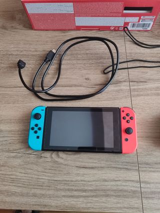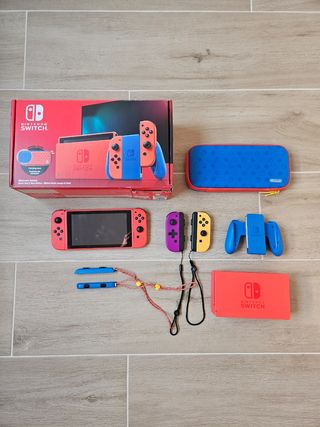 Nintendo Switch versión 2019 (mejor batería) con Joycons Rojo/Azul neón en perfecto estado, con funda, maletín de transporte donde encaja la consola con la funda más dock, adaptador, cables, juegos y mandos. Incluye: - Joycons originales - Mandos Hori (los mejores para jugar en modo portátil) - Juego Rigfit para hacer ejercicio con todos sus accesorios - Maletín rígido de transporte con espacio para guardarlo todo - Funda protectora que encaja en el maletín (con bolsillos individuales para juegos) - Tarjeta Micro SD Sandisk Ultra de 256 GB - Cables originales de Nintendo - Dock y cargador original