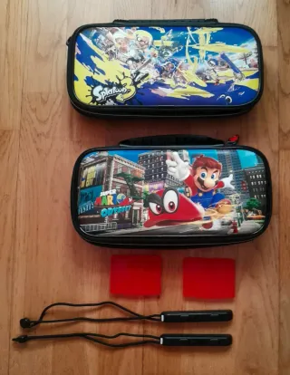 Lote de accesorios para Nintendo Switch. - Funda temática de Splatoon. - Funda temática de Super Mario Odyssey. - Dos protectores de Joy-Con rojos. - Dos cuerdas para mandos Joy-Con. -Y demás cosas de las imágenes.