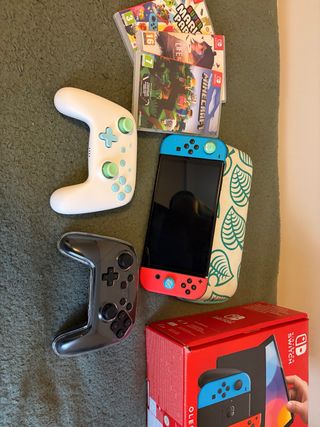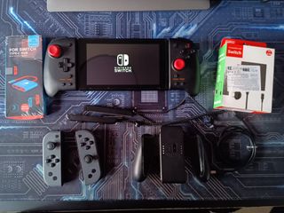 Consola Nintendo Switch OLED con sus accesorios. - Incluye funda protectora. - Grip para mandos. - Base de carga. - Cargador de corriente. - Protector de pantalla Ivoler. Con todos los complementos en perfecto estado! usada escasas veces.. se vende por no usarse.