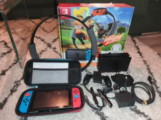 Consola Nintendo Switch con Joy-Cons en azul y rojo. **NO INCLUYE EL JUEGO** ring fit, solo los accesorios. El juego es virtual y no se puede traspasar. - Incluye consola y mandos. - Pantalla táctil con protector de pantalla colocado. - Protector de pantalla extra. - Funda - Accesorios Ring Fit. - Diseño híbrido para jugar en modo TV, sobremesa o portátil.