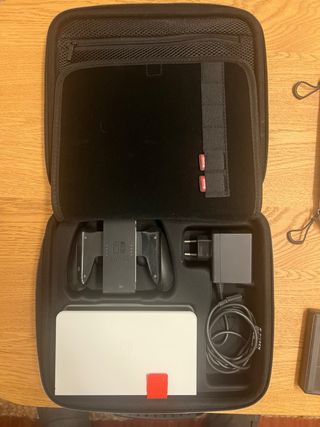 Consola Nintendo Switch modelo OLED en color blanco. Incluye los mandos Joy-Con. - Pantalla OLED. - Base de carga. Accesorios: - Funda de viaje - Funda protectora para Nintendo Switch, base de carga, cargador, y mando - Correas de Joy-Cons - Almacenador de juegos - Micro SD de 128Gb Juegos físicos incluidos: - Battle Chasers - Darksiders Genesis - Dragon Quest XI - It takes two - Mario Kart 8 - Mario Party Superstars - Terraria - The Legend of Zelda: Breath of the Wild - Trials of Mana Cuento con varios juegos digitales que se puede negociar el dejar instalados en la memoria micro-SD. Entrego en persona únicamente
