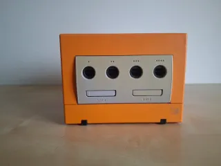 Consola de videojuegos Nintendo GameCube en llamativo color naranja. Este modelo es la versión japonesa. - Diseño compacto y distintivo. - Puertos para mandos y tarjetas de memoria.
