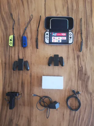 Consola Nintendo Switch OLED en excelente estado. Incluye todos sus accesorios originales. – Joy-Cons Extra, Cargador y Funda Tomtoc Descripción: Nintendo Switch OLED en excelente estado, funciona perfectamente y muy bien cuidada. ✔️ Base / dock incluida ✔️ Cargador original incluido ✔️ Par extra de Joy-Cons (2 mandos adicionales) ✔️ Soporte adicional para Joy-Cons ✔️ Estación de carga para 2 pares de Joy-Cons ✔️ Funda Tomtoc rígida con espacio para 10 tarjetas de juego La pantalla está en perfecto estado, sin arañazos. Todos los botones y Joy-Cons funcionan perfectamente (sin drift).