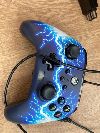 Mando de Xbox con un diseño único y llamativo de rayos en tonos azules y negros. Se encuentra en excelente estado. Usado 1 semana. - Diseño personalizado de rayos. - Colores: azul y negro. -Se incluye dos fundas azules para los josteis. Precio algo negociable.