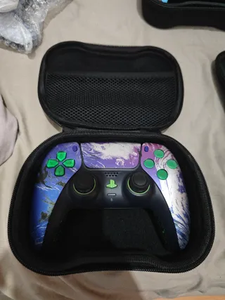 Mando Dualsense para PS5 con un diseño personalizado único. - Diseño artístico con tonos morados, azules y blancos. - Botones frontales en color verde. - Incluye funda protectora negra con malla interior.