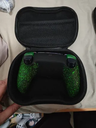Mando Dualsense para PS5 con un diseño personalizado por mi en tonos cobre y verde. Incluye una batería cambiada con más del doble de capacidad, además de joysticks de aluminio y gatillos translúcidos - Carcasa frontal y trasera en color naranja - Botones y joysticks en color verde brillante. - Incluye funda protectora negra de regalo
