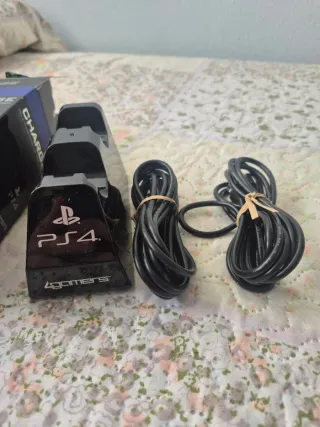 Cargador para mandos de PlayStation 4 de la marca 4gamers. Incluye soporte de escritorio y cables. - 2 cables USB para carga y juego. - Soporte de escritorio para mandos.