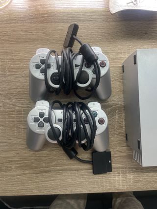 Consola clásica Playstation 2 en color plateado. Incluye dos mandos uno de ellos le falta la gomita de un jostyc Consola funcionando perfectamente! - Dos mandos incluidos. - Cableado y adaptadores necesarios. NO SE HACE DEVOLUCION WALLAPOP!