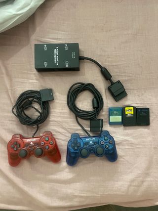 Pack de accesorios para PlayStation 2 que incluye un Multi Tap para 4 jugadores, dos mandos (uno rojo y otro azul) y varias Memory Cards. - Multi Tap 4 Player compatible con PS2. - Mando DualShock 2 rojo. - Mando DualShock 2 azul. - Memory Card 8MB (azul). - Memory Card 16MB (negro). - Memory Card 8MB (negro). NO SE HACE DEVOLUCION WALLAPOP!