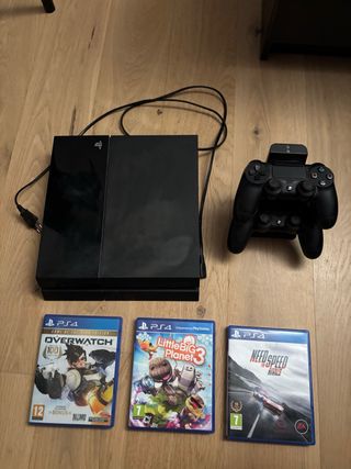 Se vende PS4 en muy buen estado y funcionando perfectamente. Siempre bien cuidada, sin fallos ni sobrecalentamiento. Incluye: - 2 mandos DualShock 4 originales - Cable de alimentación - 3 juegos: Overwatch, Need for Speed Rivals y LittleBigPlanet 3 Lista para usar desde el primer momento. Precio negociable.
