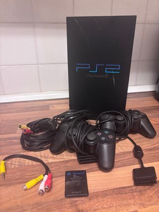 Consola PlayStation 2 en color negro, ideal para revivir tus juegos favoritos. - Incluye dos mandos. - Tarjeta de memoria de 8 MB. - Cables de conexión AV.
