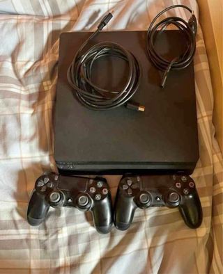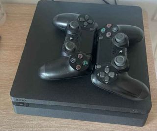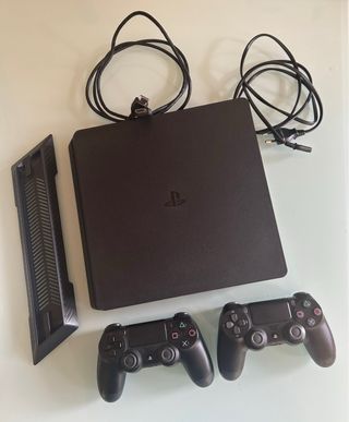 Consola Playstation 4 Slim en color negro con disco duro de 500 GB. La consola no tiene marcas de uso y todo funciona perfectamente, está lista para jugar. - Incluye dos mandos Sony DualShock. - Incluye soporte vertical para la consola. - Incluye cables de conexión.