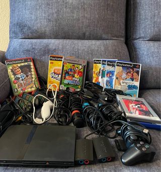 PlayStation 2 en buen estado, con algunos cables y cargadores. Incluye 2 mandos y 5 juegos: SingStar, Buzz, dos juegos de deportes y otro más. - 2 mandos - 5 juegos - Varios cargadores y cables y de regalo maleta