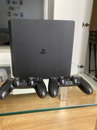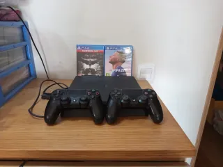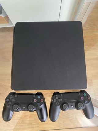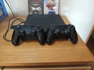 Consola PlayStation 4 Slim en color negro. EN PERFECTO ESTADO con sus cables y todo (no salen en la foto) INCLUYE 2 mandos divinos con funda y 3 juegos originales - Modelo Slim para un diseño más compacto. - Acabado en negro mate.