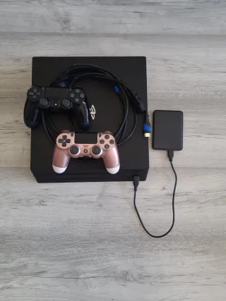 Consola 4k PlayStation 4 Pro de 1TB+memoria extraible de 1TB.Incluye dos mandos DualShock 4 El mando color oro rosa falla un poco el botón L3 pero funciona se puede jugar con el.