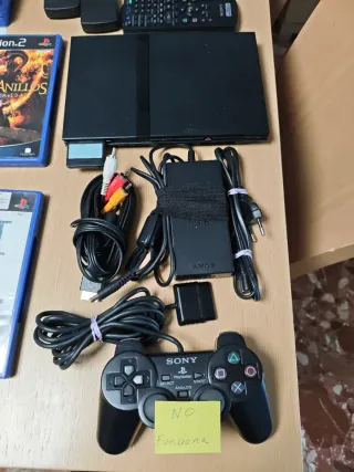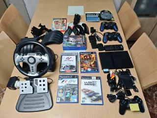Lote de consola PlayStation 2 en color negro, junto con varios accesorios y juegos. - Incluye volante con pedales. - Dos mandos inalámbricos, 1 tiene desperfectos. - Mando a distancia original, no funciona. - Juegos: Gran Turismo 4, F1 04, Señor de los Anillos, WRC: Rally Evolved, Buzz con sus mandos. -Tarjeta de memoria de 8 MB. - Cables y adaptadores.