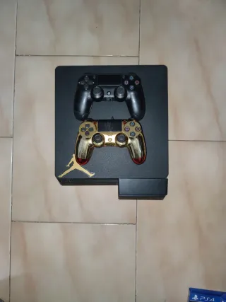 Consola PlayStation 4 Slim en acabado negro con detalles dorados en los mandos. -Esta muy bien lo malo es que en un mando no va el triángulo pero lo demás está muy bien todo y le falta la gomita pero está bien y es muy cómodo - Consola PS4 Slim. - Mando DualShock 4 negro. - Mando DualShock 4 dorado con diseño Jordan. - Soporte para la consola.