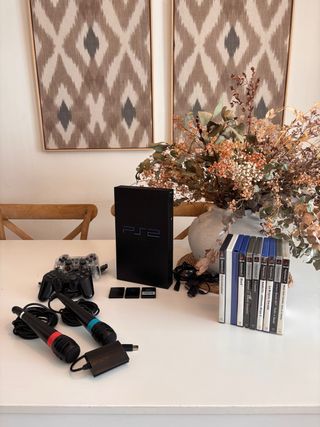 Pack completo de PlayStation 2 listo para disfrutar. - Consola PS2. - Mando de control. - Dos micrófonos. - Tarjetas de memoria. - Varios juegos incluidos.
