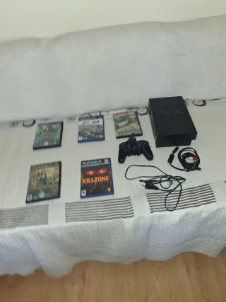 Se vende consola PlayStation 2 en color negro, junto con varios juegos y accesorios. - Consola PlayStation 2. - Mando de control. - Cables de conexión. - Juegos: Killzone, Gran Turismo 4, F1 2006, y dos más. - Incluye todos los cables necesarios para su funcionamiento.