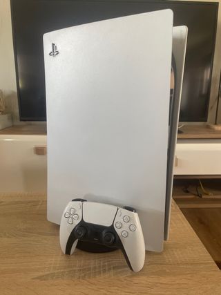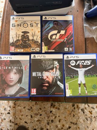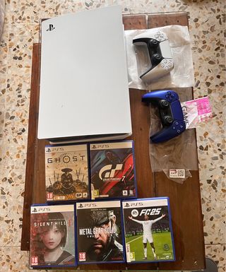 Se vende pack completo de PlayStation 5 con lector de disco. Incluye consola, dos mandos (uno blanco y otro azul) y cuatro videojuegos. El mando azul está recién reparado con un año de garantia Game y el blanco el drift izquierdo estropeado. - Consola PlayStation 5 con disco duro de 825GB. - Mando DualSense blanco. - Mando DualSense azul. - Videojuego: Ghost of Tsushima. - Videojuego: Gran Turismo 7. - Videojuego: Silent Hill. - Videojuego: Metal Gear Solid: Snake Eater. - Videojuego: EA Sports FC 25. SIN CAJA ORIGINAL