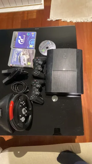 Consola PlayStation 3 en color negro, lista para horas de diversión. - Incluye volante para una experiencia de conducción inmersiva. - Dos mandos para jugar con amigos. - Tres juegos para empezar a disfrutar desde el primer momento. Viene con los cables de carga para los mandos y el soporte para mantener el volante en la mesa