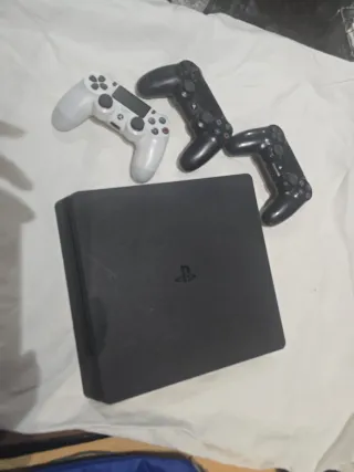 Consola PlayStation 4 de 500 GB en excelente estado, junto con dos mandos y varios videojuegos. - Consola PS4 Slim negra. - tres mandos inalámbricos (uno negro y dos blancos). - Juegos incluidos: FIFA 23, FIFA 21, Grand Theft Auto V, NBA 2K22. - Base de carga para mandos.
