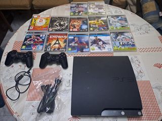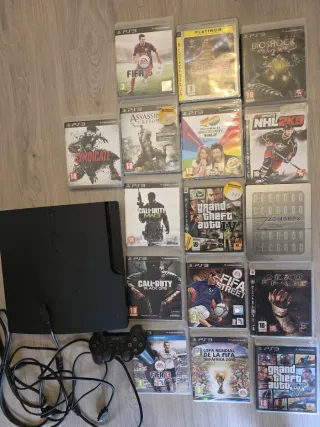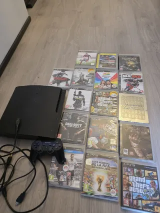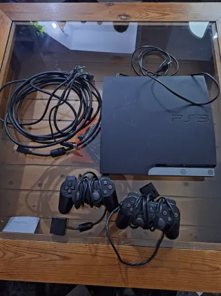 Consola PlayStation 3 Slim con disco duro de 250GB. - Incluye tres mandos. (creo que uno de los mandos fallaba, no recuerdo cual era). - Incluye cables de conexión. - 7 juegos. Tiene algunas rayas en la carcasa que no afectan al funcionamiento. Solo estético. Funciona correctamente.
