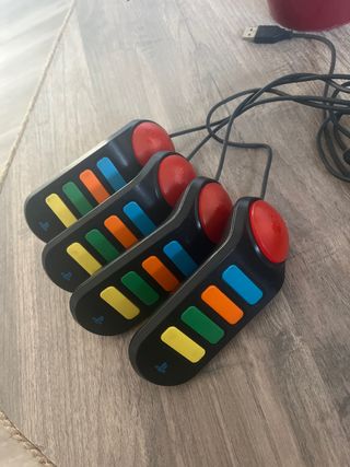Set de 4 buzzers originales PlayStation compatibles con PS2 y PS3. Ideales para jugar a Buzz! El Gran Reto, concursos, trivia y juegos familiares 🎉 Perfectos para fiestas, reuniones y tardes en familia. Juego para 4 jugadores. 🔹 Incluye 4 mandos tipo pulsador 🔹 Funcionan correctamente 🔹 Botones de colores en buen estado 🔹 Conexión USB Compatible con juegos Buzz PlayStation PS2 y PS3. Se venden por no usar. 📦 Envío rápido 🚭 Hogar libre de humo 💬 Acepto ofertas razonables