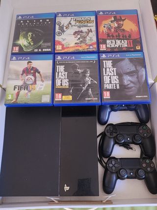 Consola PlayStation 4 Slim en color negro, junto con una selección de juegos y mandos. - Juegos incluidos: Alien Isolation, Trials Fusion, Red Dead Redemption 2, FIFA 15, The Last of Us Remasterizado, The Last of Us Parte II. - Incluye 3 mandos mandos DualShock (un mando funciona bien, los otros dos tienen fallos, en algunos juegos dependiendo de los botones a utilizar no se nota pero para otros no sirven) - Cableado necesario para su funcionamiento. NO SE VENDE NADA POR SEPARADO.