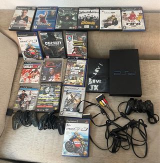 Consola PlayStation 2 en color negro, ideal para revivir tus juegos favoritos. Incluye dos mandos y varios accesorios. - Juegos incluidos: F1 2001, Pro Evolution Soccer 5, y un juego adicional. - Dos mandos de control. - Cables de conexión y alimentación.