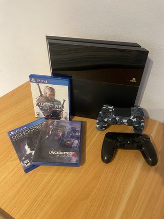 Consola PlayStation 4 con dos mandos y varios videojuegos. - Incluye los juegos: The Witcher 3: Wild Hunt, Dishonored Definitive Edition y Uncharted 4: El Desenlace del Ladrón. - Un mando de camuflaje y otro negro.