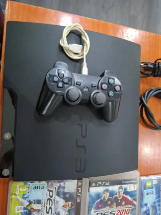 Consola PlayStation 3 en color negro, con mando y varios juegos. - Mando NO original batería en mal estado. - Juegos incluidos: PES 2010, PES 2012 y PES 2014 - Inculye cable de corriente y cable HDMI