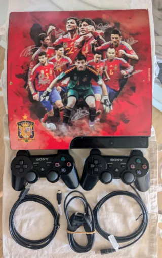 Oportunidad coleccionistas. PS3 Slim (CECH-3004A), Unidad 5951 de 15.000 Edición Selección Española. ESTADO: Funcionamiento 10/10. Estéticamente con desgaste lógico por el uso y los años; el laminado tiene algunos detalles (ver fotos). INCLUYE: Consola 160GB (Ed. Numerada). 2 Mandos originales Sony (sin drift). 2 Cables carga + Cable alimentación. (No incluye HDMI) Consola formateada de fabrica. Vendo por no usar. Envío protegido o trato en mano. Precio ajustado por exclusividad y accesorios originales, pero escucho ofertas.