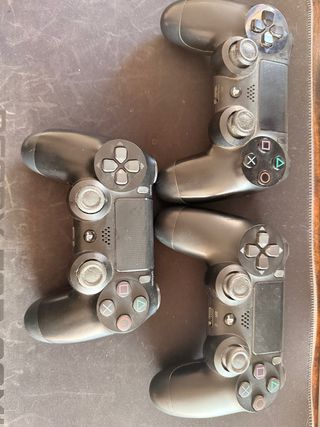 Lote de tres mandos originales para PlayStation 4. Dos mandos son V2 y uno es V1. Mando 1 V2 -> tiene un pelin de drift en el joystick derecho pero se puede jugar perfectamente, casi inapreciable. Mando 2 V2 -> Bastante drift en el joystick izquierdo, habría que repararlo. Mando 3 V1 -> Sin drift pero la batería se ha roto o el pin de carga no funciona (se me sobrecalentaba bastante hasta que dejó de cargar) También acepto cambio por un mando de PS5 en buen estado más dinero por la diferencia de precio. - Color negro. - Incluye los mandos completos.