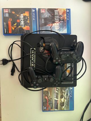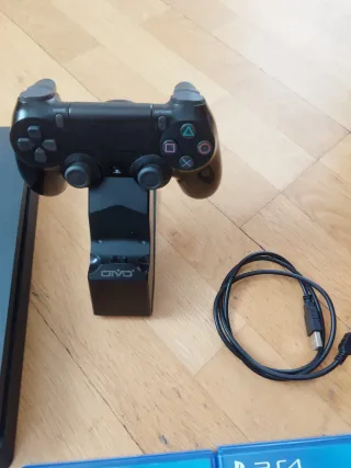 Vendo Playstation 4 Slim 500gb en perfecto estado. Durante el poco uso que se le ha dado, nunca ha dado ningún problema. Incluyo consola, cable alimentación, 2 mandos, cable de carga de mando, y 4 juegos en perfecto estado. Además va en su caja original.