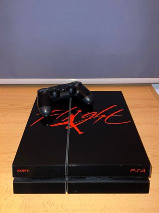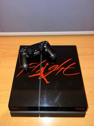 PlayStation 4 en estupendas condiciones. Incluye una consola PlayStation 4 con un mando y sus correspondientes cables, La consola presenta un diseño especial de edición limitada con el logo de Flight jordan en rojo sobre un fondo negro.