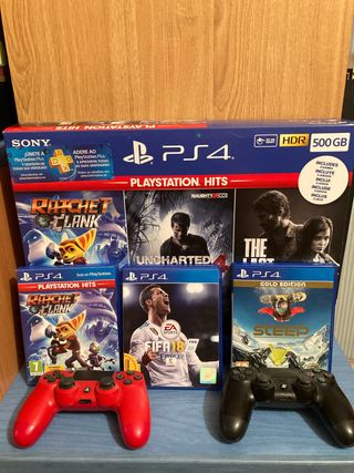 Consola Playstation 4 (PS4) de 500GB. Está en perfectas condiciones. Incluye 2 mandos y 3 juegos físicos, los que se ven en la foto (No incluye Uncharted 4 y The Last of Us) Viene con su caja original y los cables necesarios. La consola va envuelta dentro de la caja en un plastico protector. Todo perfecto 🎮👌